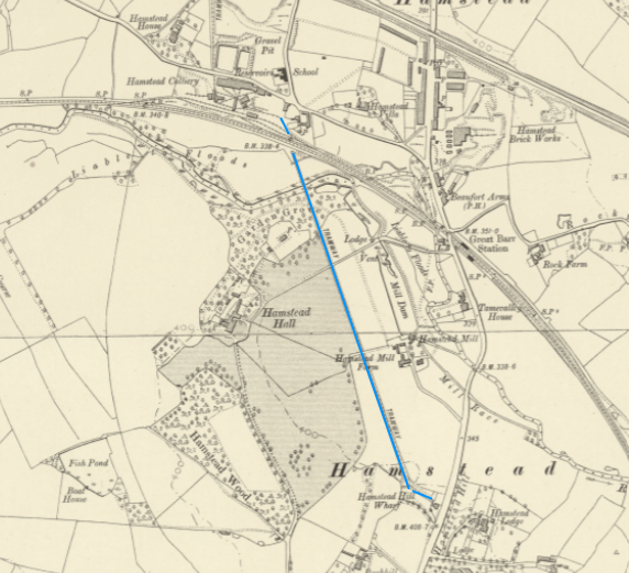 To facilatte the transport of coal a wharf was operated at the top of Hamstead Hill. This was connected to the colliery about 0.8 miles away by a tramway (shown as blue line on map) This avoided having to try bringing the coal up the steep Hamstead Hill.